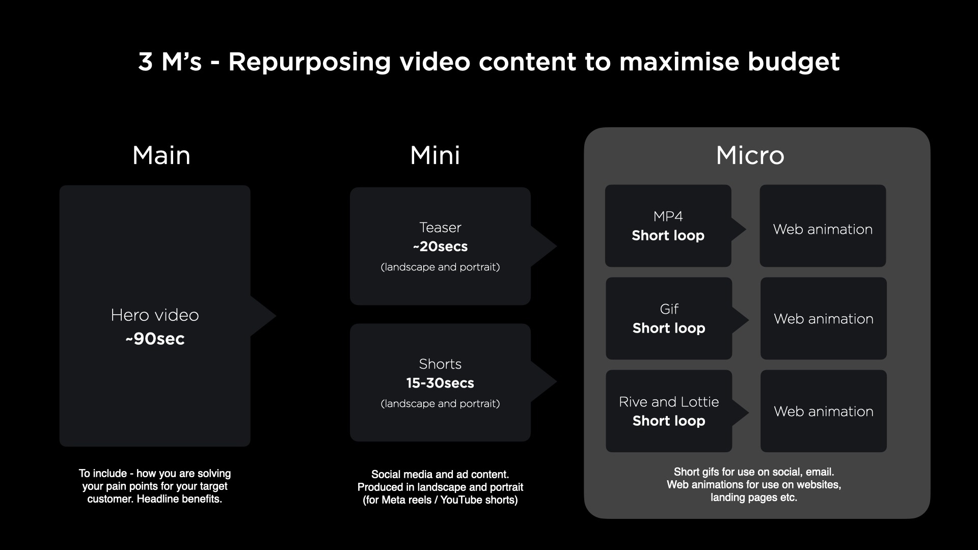 This is where the strategy of producing one main film and cleverly repurposing it with mini edits comes into play. Where appropriate, you can also use it to create micro content (films or animations). Extracting key moments and insights from the hero video means marketers can tailor their content to suit different platforms and audience preferences.